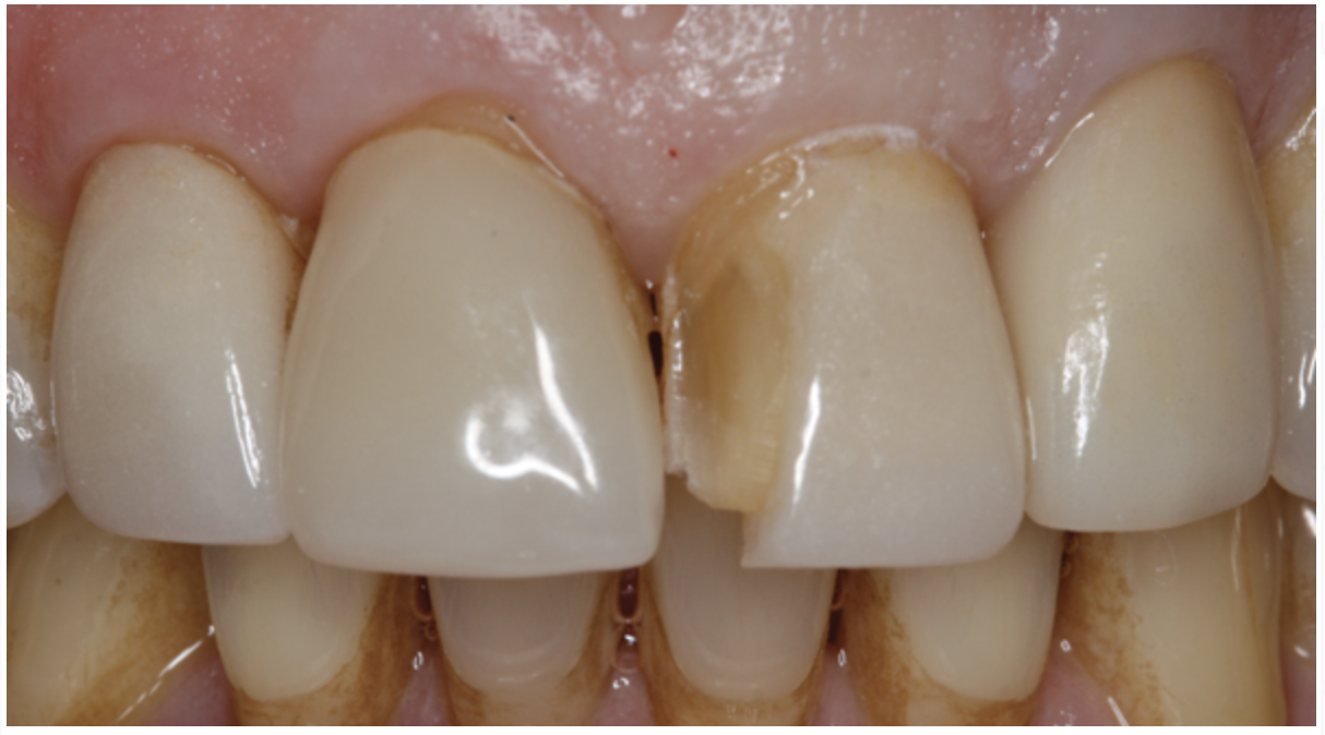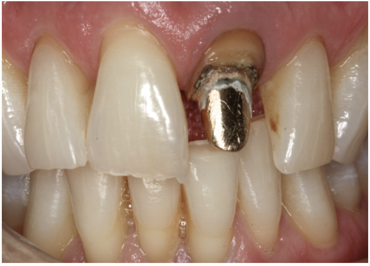 A patient presented with a fractured porcelain crown, recurrent decay, and previously placed cast gold endodontic post on tooth No. 9 (Figure 8). After all treatment options were considered, the patient chose to replace the fractured crown. Because the shape, size, and form of tooth No. 9 were undesirable and the biogeneric copy method inappropriate, tooth No. 8 would be used as a biogeneric reference and model for the final restoration.