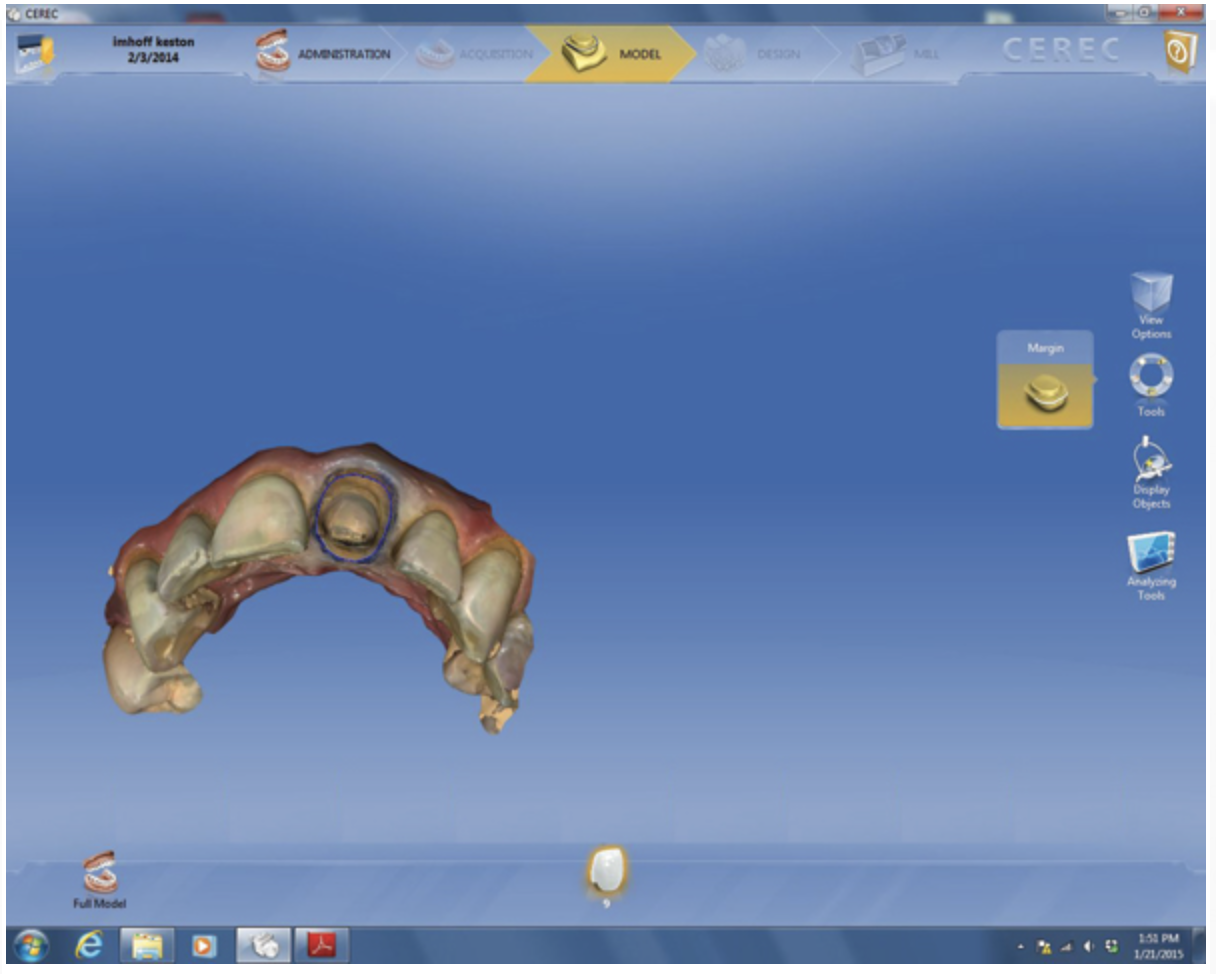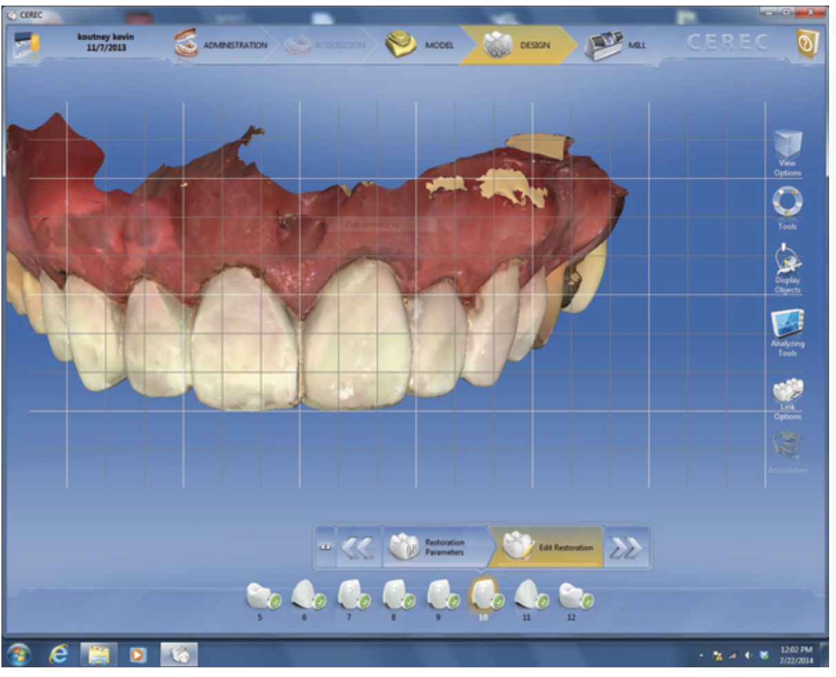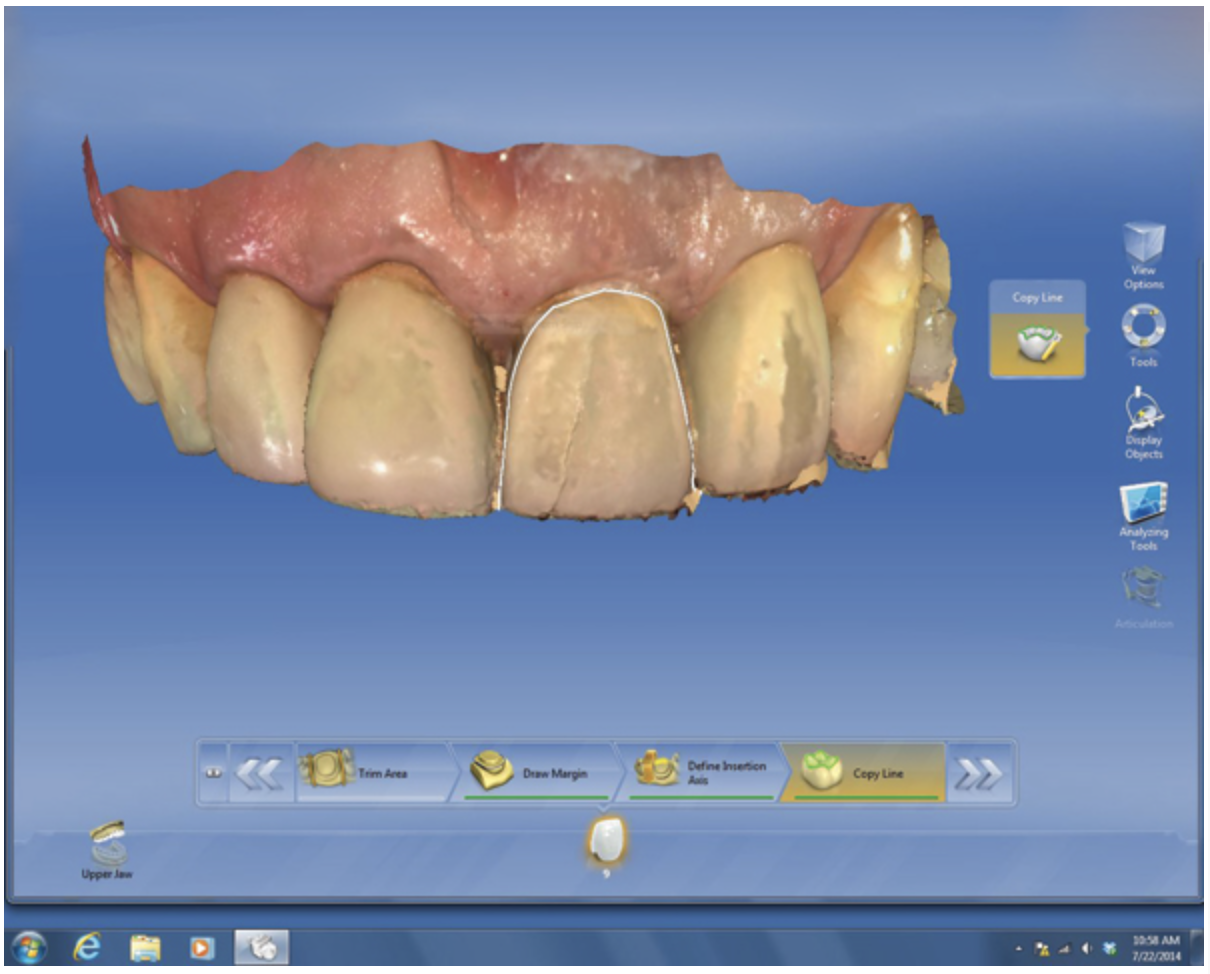 The veneer on No. 9 was then completely removed and the tooth prepared. A scan of the preparation was taken and placed into the “Upper Arch” folder (Figure 2). The software was used to marginate the preparation, and the insertion axis was established for the new restoration. A line was drawn around the entire tooth No. 9 surface (Figure 3) to include the line angles and incisal edges, and the software proposed a restoration design exactly replicating the preoperative contours and shape (Figure 4). Minor modifications were completed using the form smooth tool on the proposed veneer (Figure 5). The proximal contacts were then verified, and the veneer was milled from a lithium disilicate block (IPS Empress® CAD Multiblock, Ivoclar Vivadent). The fit of the veneer was verified intraorally (Figure 6), after which it was polished with a bristle brush (Abbott-Robinson® Brush, Buffalo Dental Manufacturing Co., Inc., www.buffalodental.com) and polishing paste (DiaShine Fine, VHTechnologies, www.vhtechnologies.com), then seated using dental adhesive (OptiBond™ XTR, Kerr Dental, www.kerrdental.com) and resin cement (NX3 Nexus, Kerr Dental) (Figure 7).
