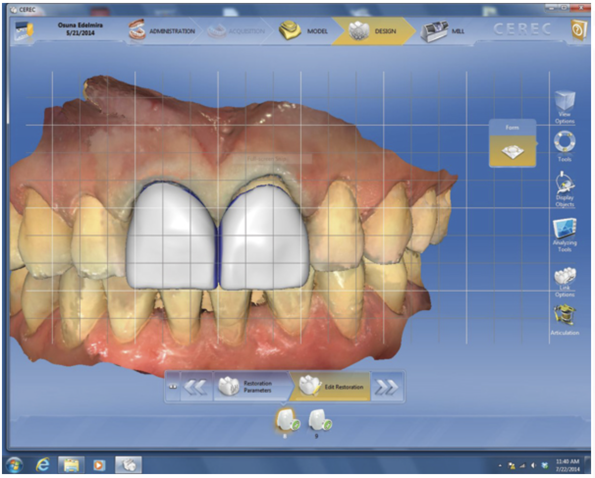 CEREC, the first chairside CAD/CAM system,14 quickly fabricates laboratory-grade chairside tooth-colored restorations (eg, full-coverage crowns, inlays/onlays, veneers) with rapid digital impression taking, simple designing, and precise machining for improved workflow and efficiency.14-16 The system’s broad spectrum of applications automates the design process for creating patient-specific restorations with easy-to-use and highly predictable and accurate software facilitating preparation and impression monitoring, so temporary restorations or conventional impressions are unnecessary.16